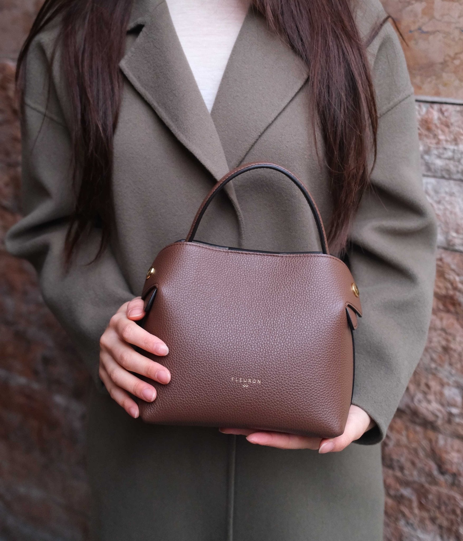 The Mini Swann in Tiramisu Grained Calfskin brings a warm, deep touch to any outfit. Its rich brown tone pairs effortlessly with neutral shades like ivory, beige, or light grey, and creates an elegant contrast with deeper hues such as camel, forest green, or midnight blue.