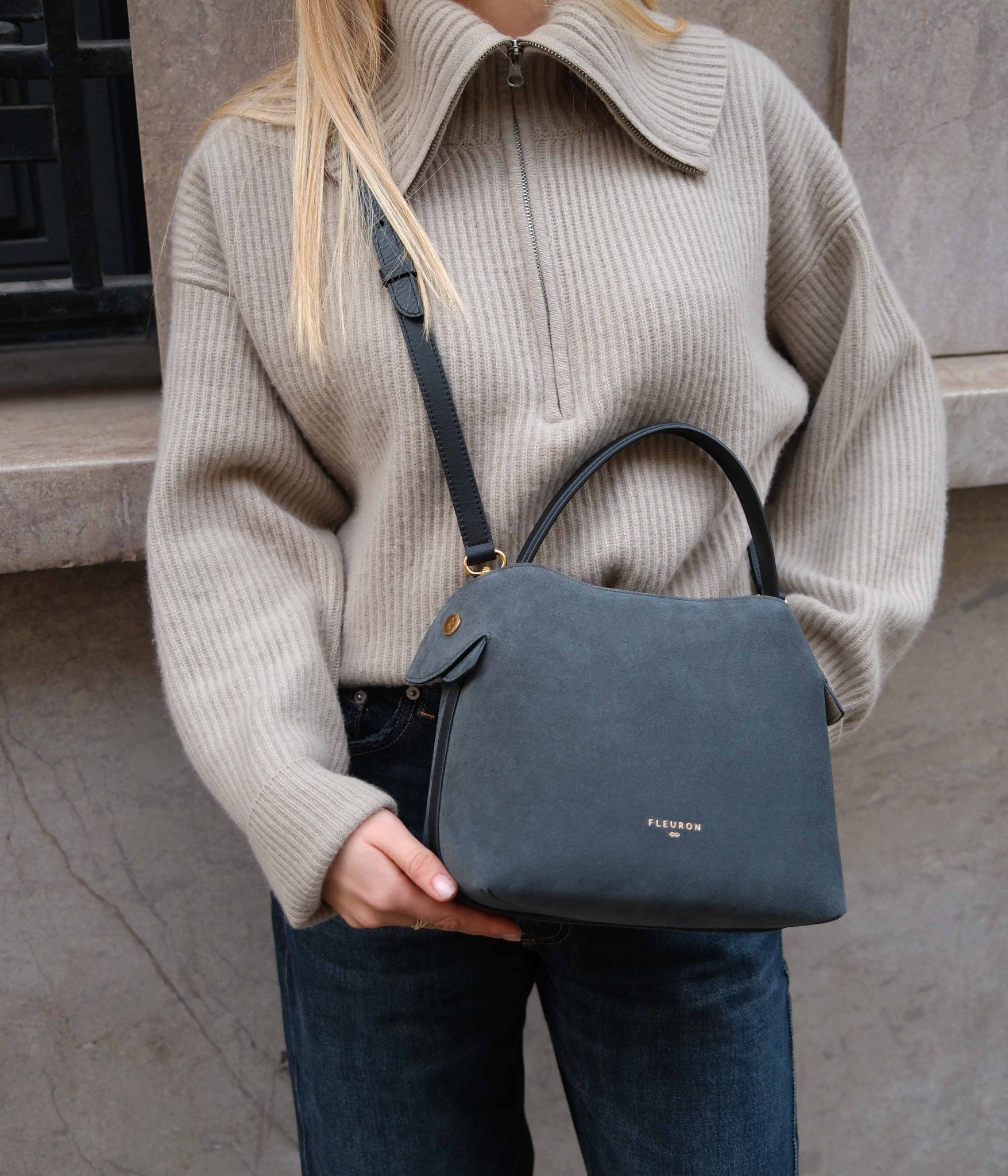 The Medium Swann in Calf Suede Orage, designed in Paris and handcrafted in Italy, captivates with its contemporary elegance and subtle character. Its Storm shade, with soft grey undertones, pairs beautifully with light tones like off-white or pearl grey, as well as deeper hues such as navy, black, or forest green for a refined, modern look.