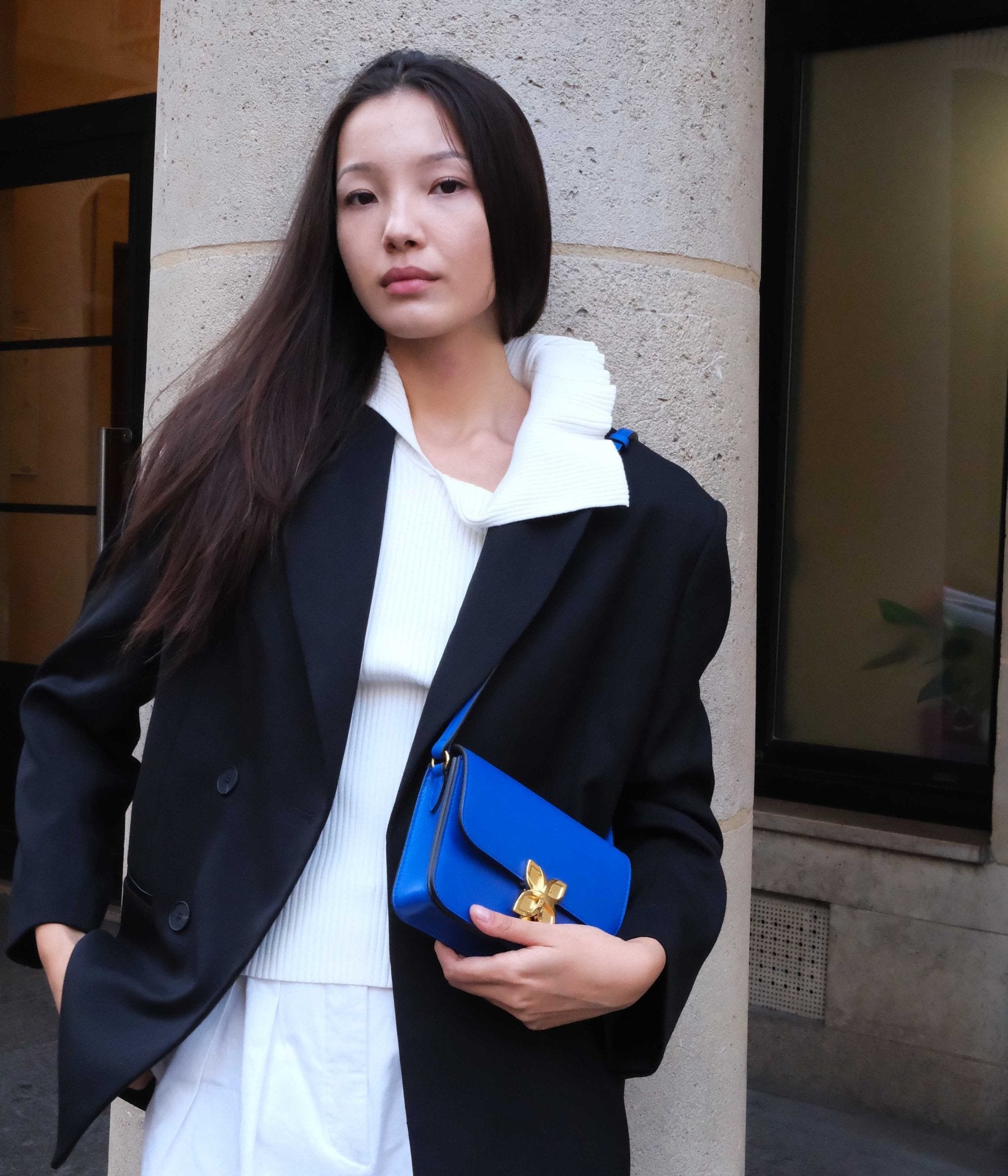 Pair the Mini Hortensia in Bleu Roi with neutral tones like white, ivory, or sand for an elegant contrast that highlights the richness of the color. For a more confident style, it also complements deeper hues such as black, charcoal grey, or burgundy, enhancing the depth of Royal Blue.